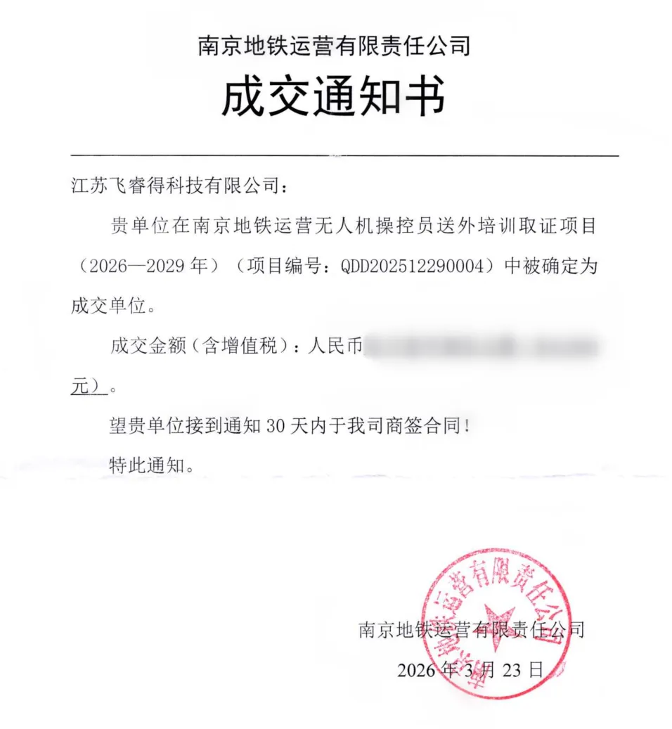 喜讯传来!近日,飞睿得凭借扎实的业务实力、丰富的培训经验与完善的服务体系,成功中标《南京地铁运营无人机操控员送外培训取证项目(2026-2029年)》,正式携手南京地铁运营有限公司,开启深度合作。